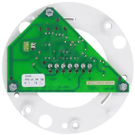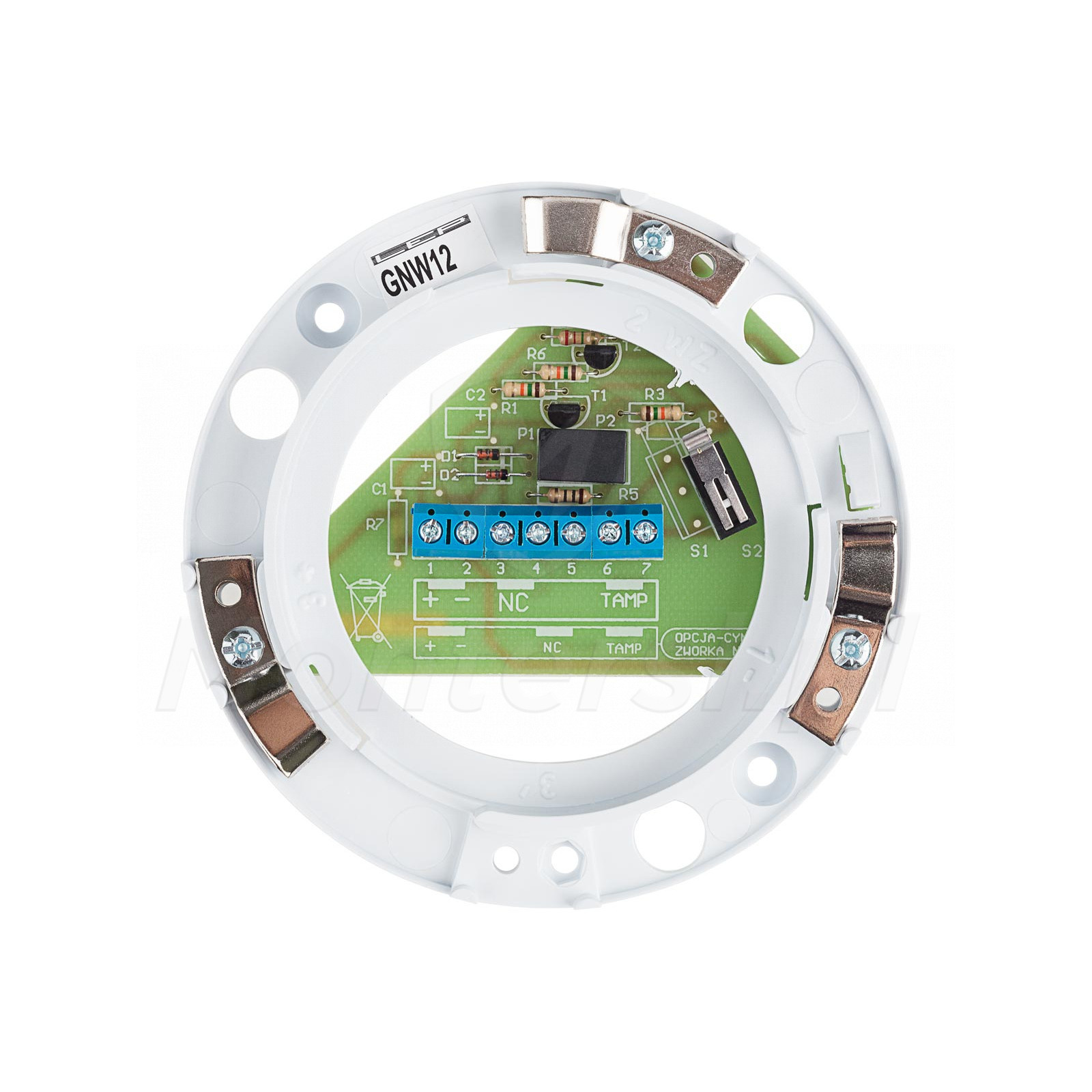 GNW12 - Sufitowe gniazdo montażowe do czujki dymu OSD23. Przy jego pomocy możliwe jest podłączenie czujki do dowolnej centrali systemu alarmowego, z linią dozorową 12 V. Z poziomu gniazda realizowane jest połączenie linii alarmowej, linii sabotażowej i zasilanie.
