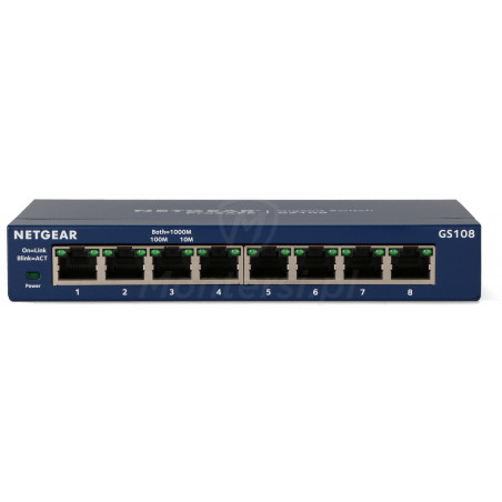 GS108GE - 8-portowy, niezarządzalny switch NETGEAR Gigabit, dedykowany do pracy w systemie monitoringu IP lub jako element standardowej sieci internetowej. Wykonany z wysokiej jakości elementów i spełniający rygorystyczne testy, cechuje się niezawodnością, stabilnymi parametrami pracy i jest energooszczędny. Do cech charakterystycznych switcha GS108GE można zaliczyć: