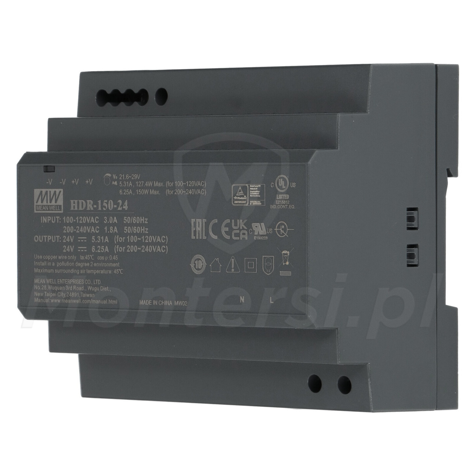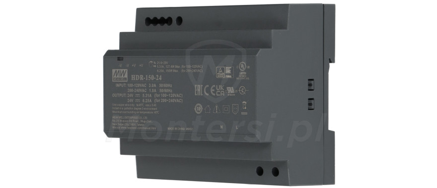 HDR-150-24 - Zasilacz na szynę DIN, dedykowany do zasilania urządzeń elektronicznych pracujących na napięciu stałym 24 V DC. Maksymalny prąd zasilacza to 6.25 A. Do jego elementów wyróżniających można zaliczyć: