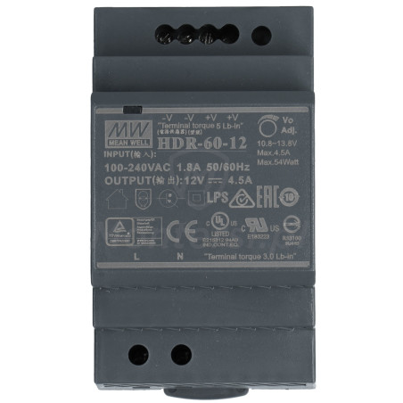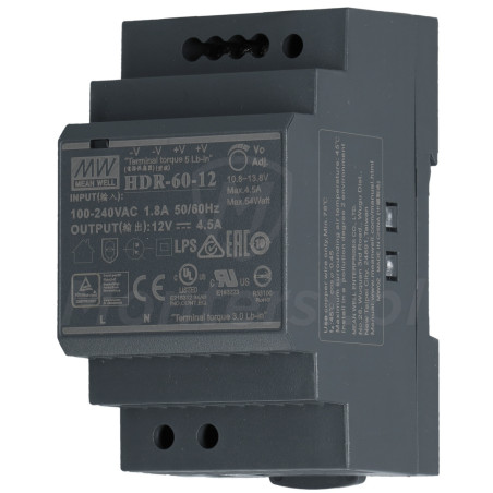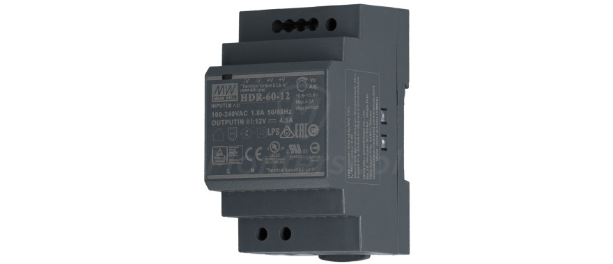 HDR-60-12 - Zasilacz na szynę DIN, dedykowany do zasilania urządzeń elektronicznych pracujących na napięciu stałym 12 V DC. Maksymalny prąd zasilacza to 4.5 A. Do jego elementów wyróżniających można zaliczyć: