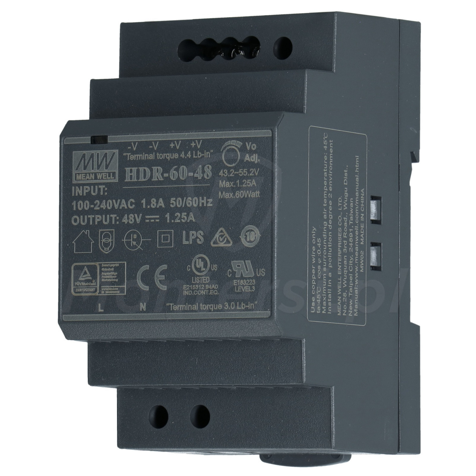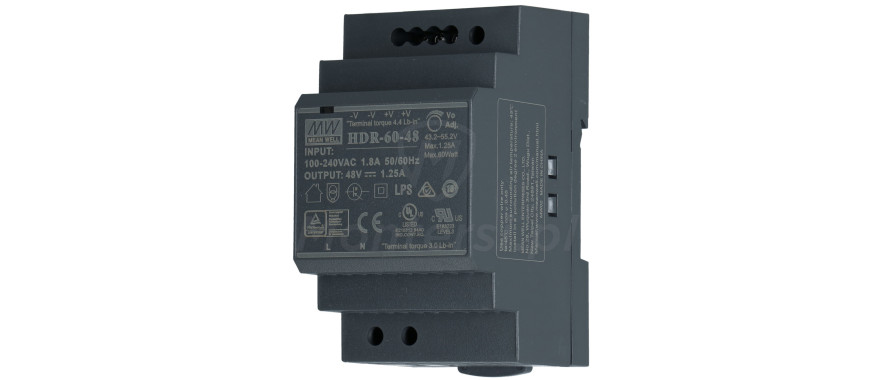 HDR-60-48 - Zasilacz na szynę DIN, dedykowany do zasilania urządzeń elektronicznych pracujących na napięciu stałym 48 V DC. Maksymalny prąd zasilacza to 1.25 A. Do jego elementów wyróżniających można zaliczyć: