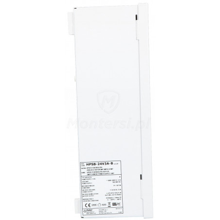 Zasilacz HPSB-24V3A-B umieszczono w natynkowej obudowie, we wnętrzu której znajduje się miejsce na dwa akumulatory 7Ah. Po ich zastosowaniu zasilacz może pracować w trybie akumulatorowym, podtrzymującym pracę podłączonych urządzeń po awarii sieci 230V AC. Zasilacz przełącza się automatycznie i natychmiastowo w tryb awaryjny, a gdy awaria ustanie, wraca do normalnego trybu pracy i rozpoczyna proces ładowania akumulatora. Prąd ładowania akumulatora można regulować w zakresie 0.5 A - 1 A.