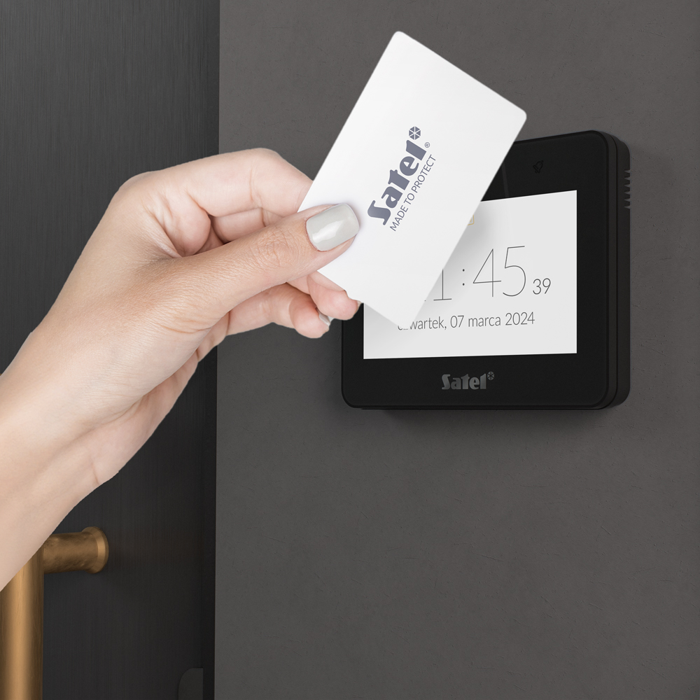 W manipulatorze zastosowano także czytnik kart Mifare. Daje nam to możliwość aktywacji lub deaktywacji systemu alarmowego bez konieczności wpisywania kodu. Jest to wygodny i zdecydowanie szybszy sposób na dostęp do systemu.