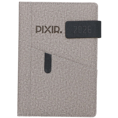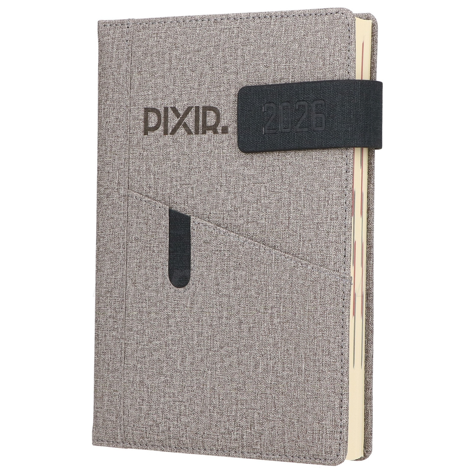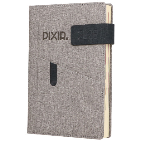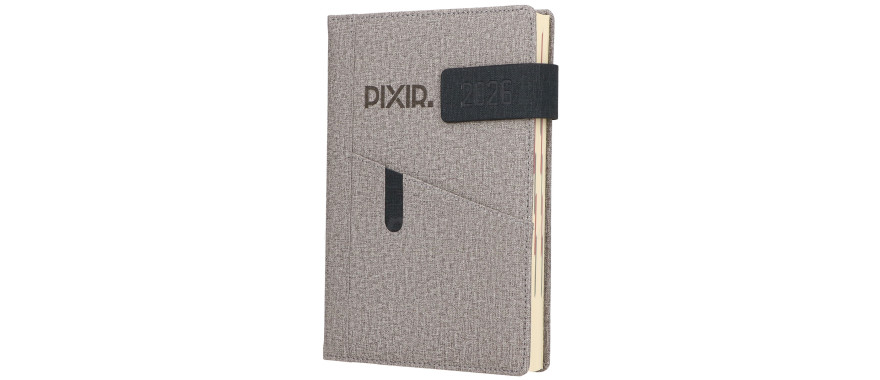 Kalendarz książkowy PIXIR na rok 2026 w formacie A5 wykonany z materiału o przyjemnej w dotyku strukturze, która nadaje mu elegancki, profesjonalny wygląd. Na okładce umieszczono wytłoczone logo PIXIR oraz rok 2026. Najważniejsze cechy kalendarza:
