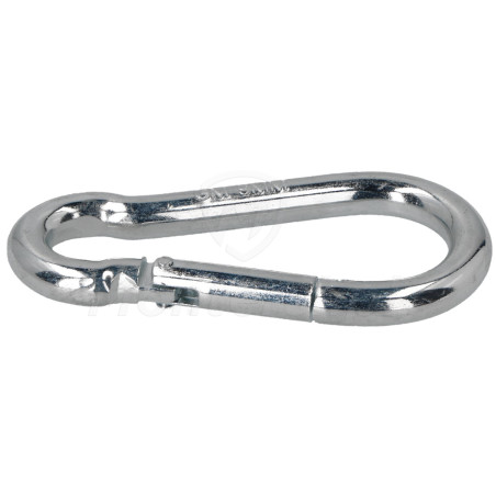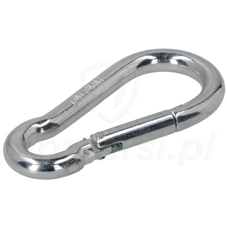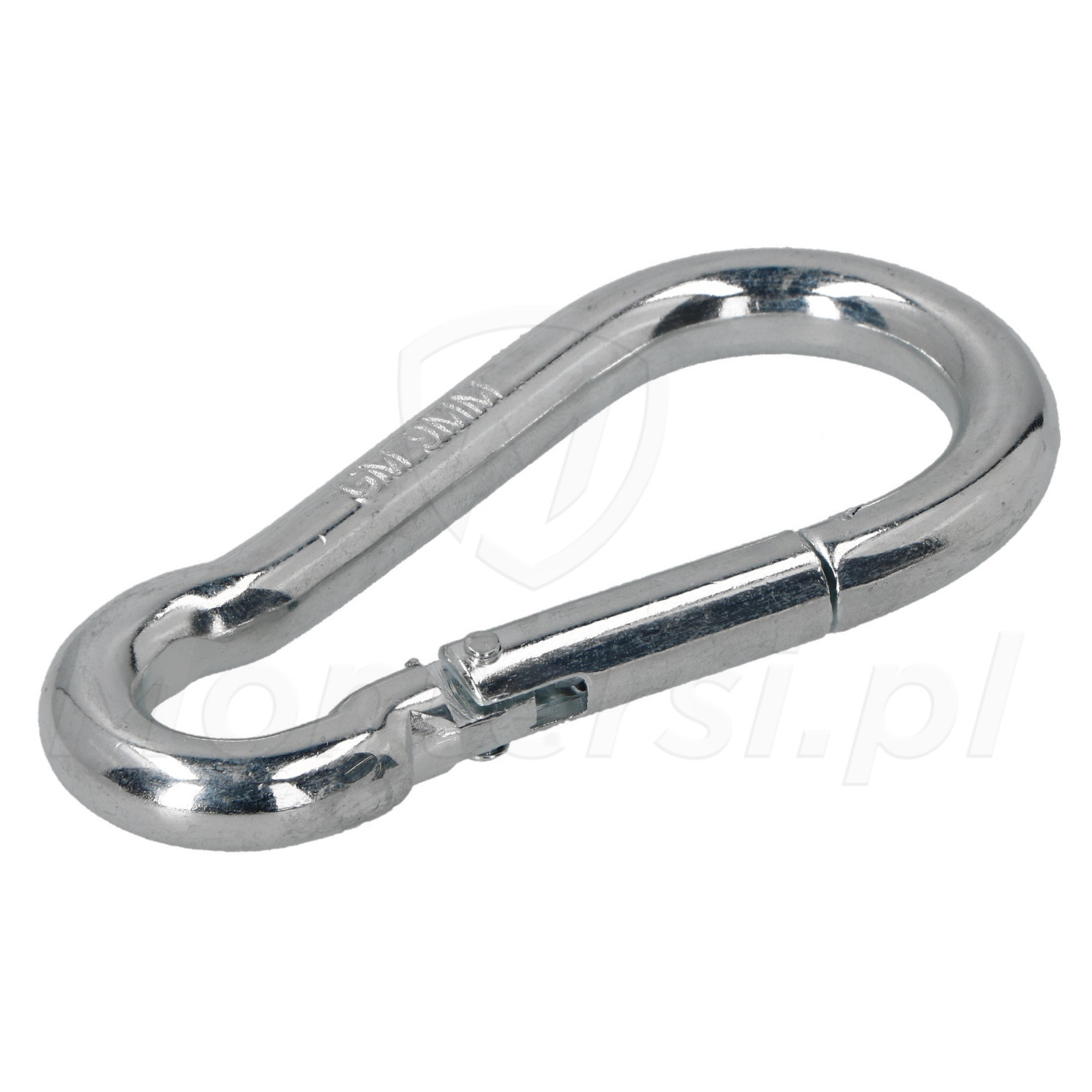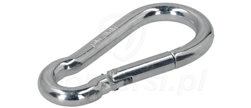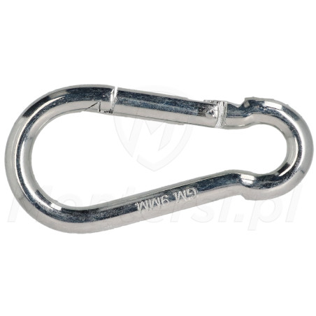 KAR-09 - Karabińczyk do lin 9 mm wykonany z ocynkowanej stali niskowęglowej. Wyposażony w sprężynujące zamykanie uniemożliwiające przypadkowe wypięcie.