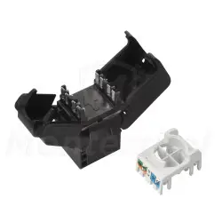 SXKJ-6-UTP-BK-SA to moduł RJ45 kategorii 6, umożliwiający szybki montaż bez użycia narzędzi. Obudowa wykonana z trudnopalnego tworzywa UL94-V0 i styki pokryte 50 µin złota gwarantują niezawodne działanie oraz wysoką odporność na zużycie. Moduł obsługuje transmisję danych do 5 Gbps i spełnia wymagania norm Cat.6/klasa E, a jego wymiary zapewniają kompatybilność z osprzętem wielu popularnych producentów.