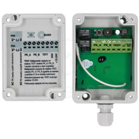 Modułu nieruchomego - urządzenie wyposażone w dwa kanały przekaźnikowe ( NO lub NC - ustawiane zworką) oraz buzzer. Moduł może w każdej chwili wysłać zapytanie o stan czujników i jeśli nie otrzyma odpowiedzi od modułu ruchomego zwolni oba przekaźniki wyjściowe.