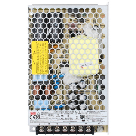 LRS-150-12 to modułowy zasilacz impulsowy, przeznaczony do współpracy z urządzeniami zasilanymi napięciem 10.2 – 13.8 V DC, których maksymalny pobór prądu nie przekracza 12.5 A.