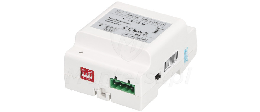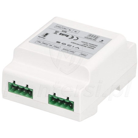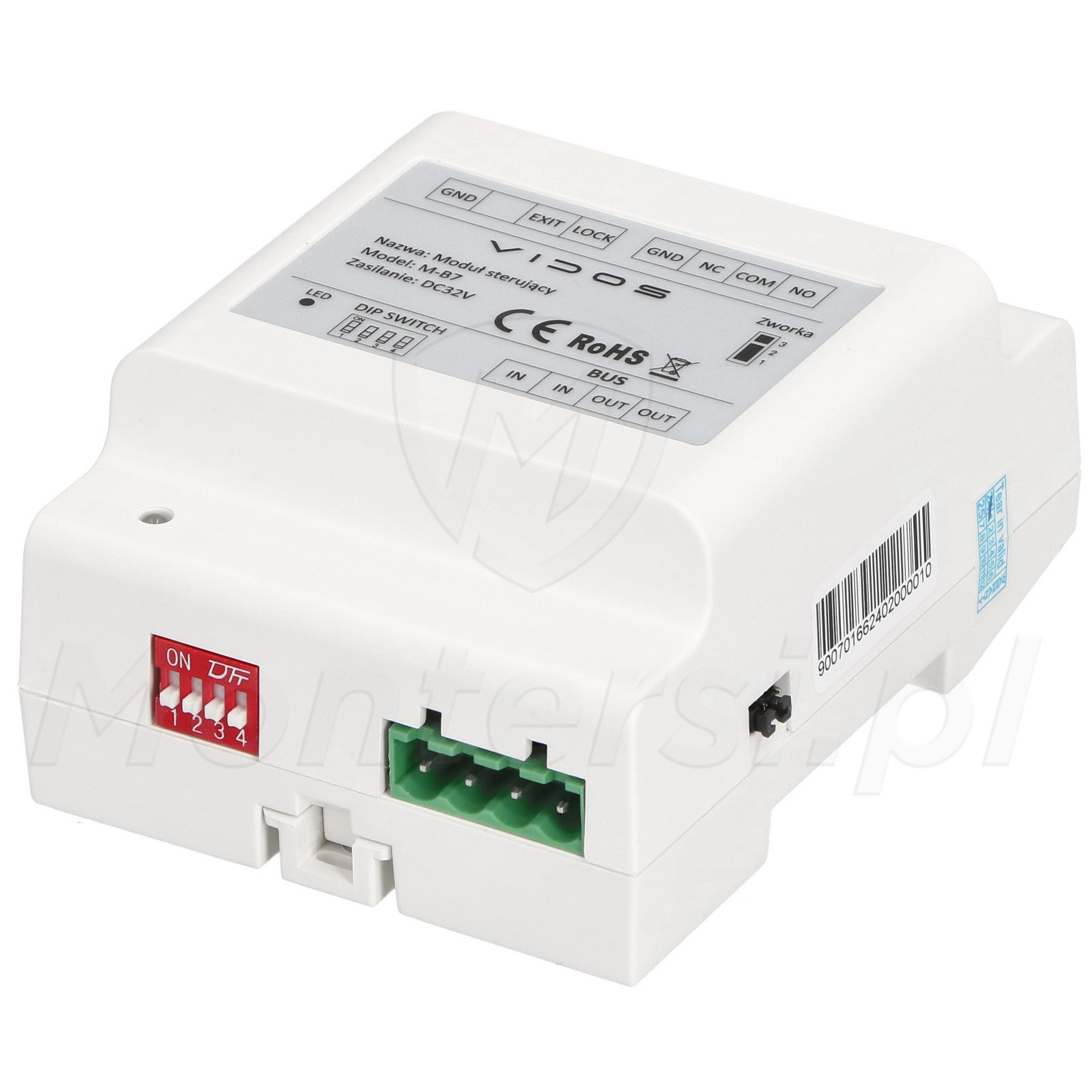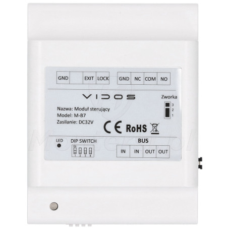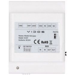M-B7 - Moduł sterujący, dedykowany do pracy w systemie Vidos 2IP. Przy jego pomocy możliwe jest wysterowanie dodatkowej bramy automatycznej lub drugiego elektrozaczepu. Moduł M-B7 może być również użyty do sterowania 2 innymi urządzeniami 24 V, o maksymalnym obciążeniu 2 A dzięki czemu możemy sterować oświetleniem lub otwarciem wejścia przy użyciu dodatkowego przycisku.