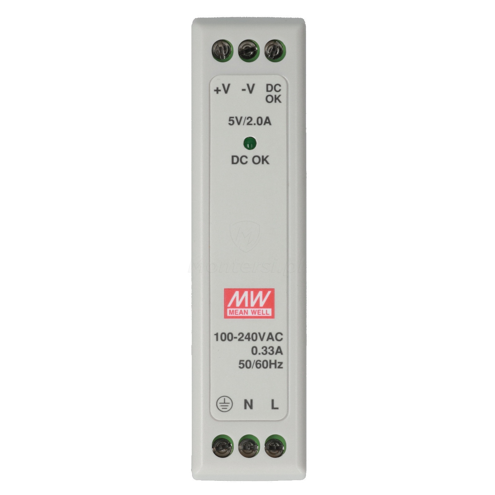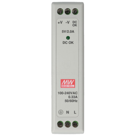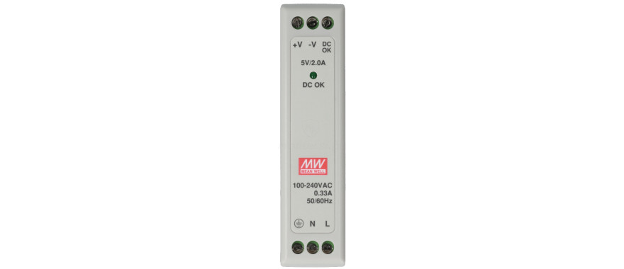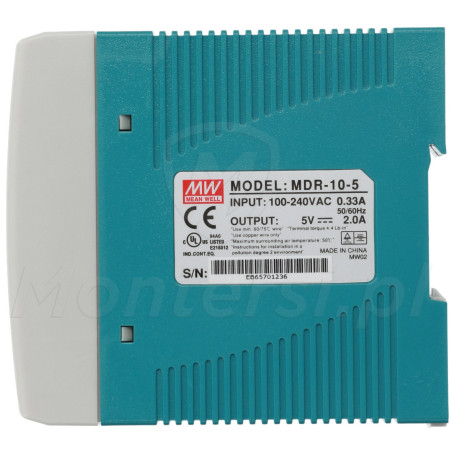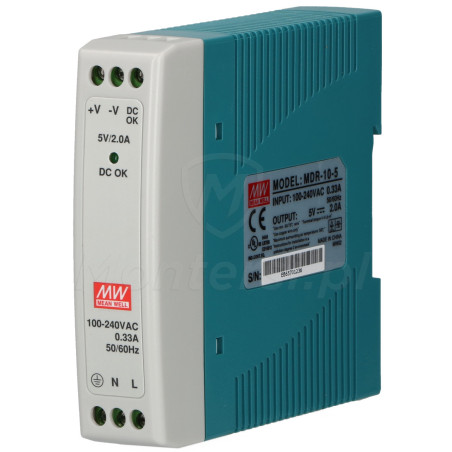 MDR-10-5 - Zasilacz na szynę DIN, dedykowany do zasilania urządzeń wymagających stabilnego napięcia 5 V DC (max. 2 A). Zaliczany do serii MDR, cechuje się niezawodnością i stabilnymi parametrami pracy ciągłej. Do elementów wyróżniających zasilacza można zaliczyć: