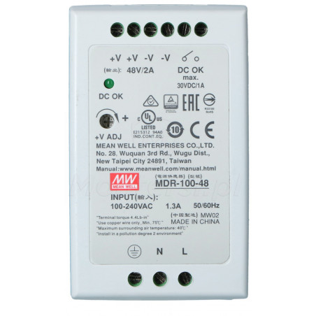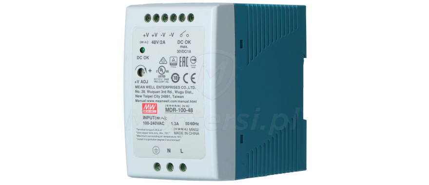 MDR-100-48- Zasilacz urządzeń elektrycznych, wymagających napięcia zasilania 48V DC, o maksymalnej mocy 96 W. Umożliwia przekształcenie napięcia z zakresu 85 - 264V AC lub 120 - 370V DC. Urządzenie jest przystosowane do montażu na szynie DIN TS-35/7.5 lub TS-35/15.