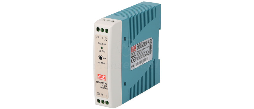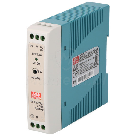 MDR-20-24 - Zasilacz urządzeń elektrycznych, wymagających napięcia zasilania 21.6 - 26.4V DC, o maksymalnej mocy 20 W. Umożliwia przekształcenie napięcia z zakresu 85 - 264V AC lub 120 - 370V DC. Urządzenie jest przystosowane do montażu na szynie DIN TS-35/7.5 lub TS-35/15. Doskonale sprawdza się w systemach alarmowych, kontroli dostępu, oświetlenia, sterowania, itp.