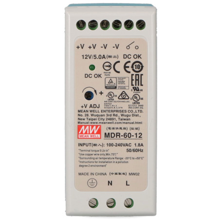 MDR 60 12 charakteryzuje się dobrymi parametrami pracy, sprawnością na poziomie 86% i nie pobiera prądu przy starcie. Zasilacz jest wyposażony sygnalizację optyczna, zrealizowaną przy pomocy diod LED.