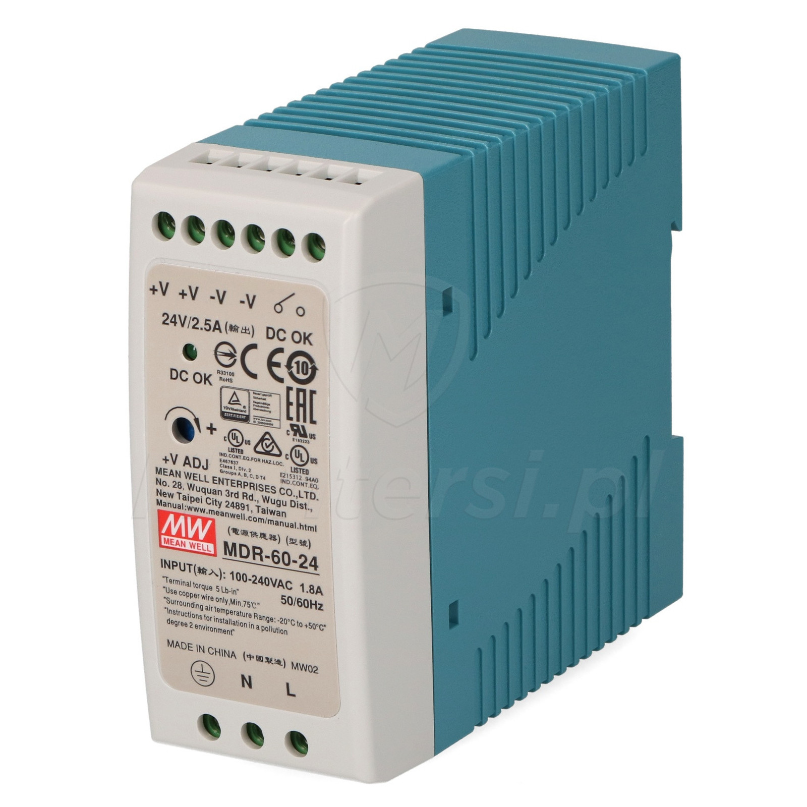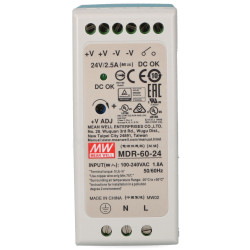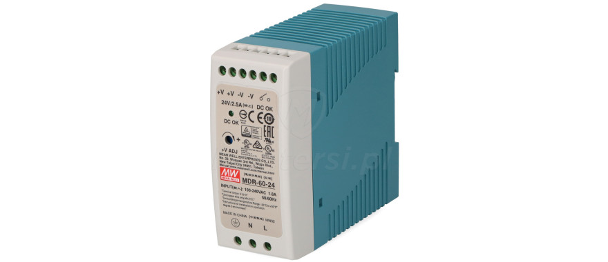MDR-60-24 - Zasilacz urządzeń elektrycznych, wymagających napięcia zasilania 24 - 30V DC, o maksymalnej mocy 60 W. Umożliwia przekształcenie napięcia z zakresu 85 - 264V AC lub 120 - 370V DC. Urządzenie jest przystosowane do montażu na szynie DIN TS-35/7.5 lub TS-35/15. Doskonale sprawdza się w systemach alarmowych, kontroli dostępu, oświetlenia, sterowania, itp.