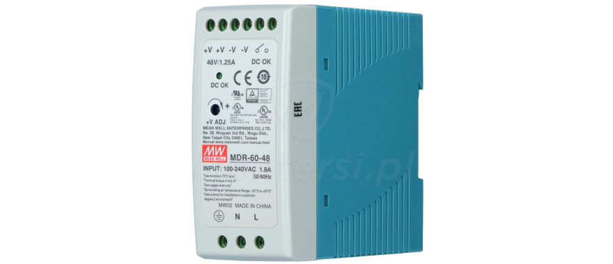 Wysokiej jakości zasilacz do urządzeń wymagających napięcia 48 - 56 DC / 1.25 A. Przystosowany do montażu na szynie DIN w odpowiedniej obudowie. Model MDR-60-48 doskonale spisuje się w zasilaniu switchy przemysłowych.