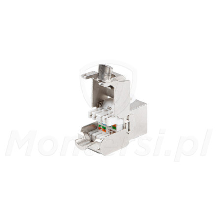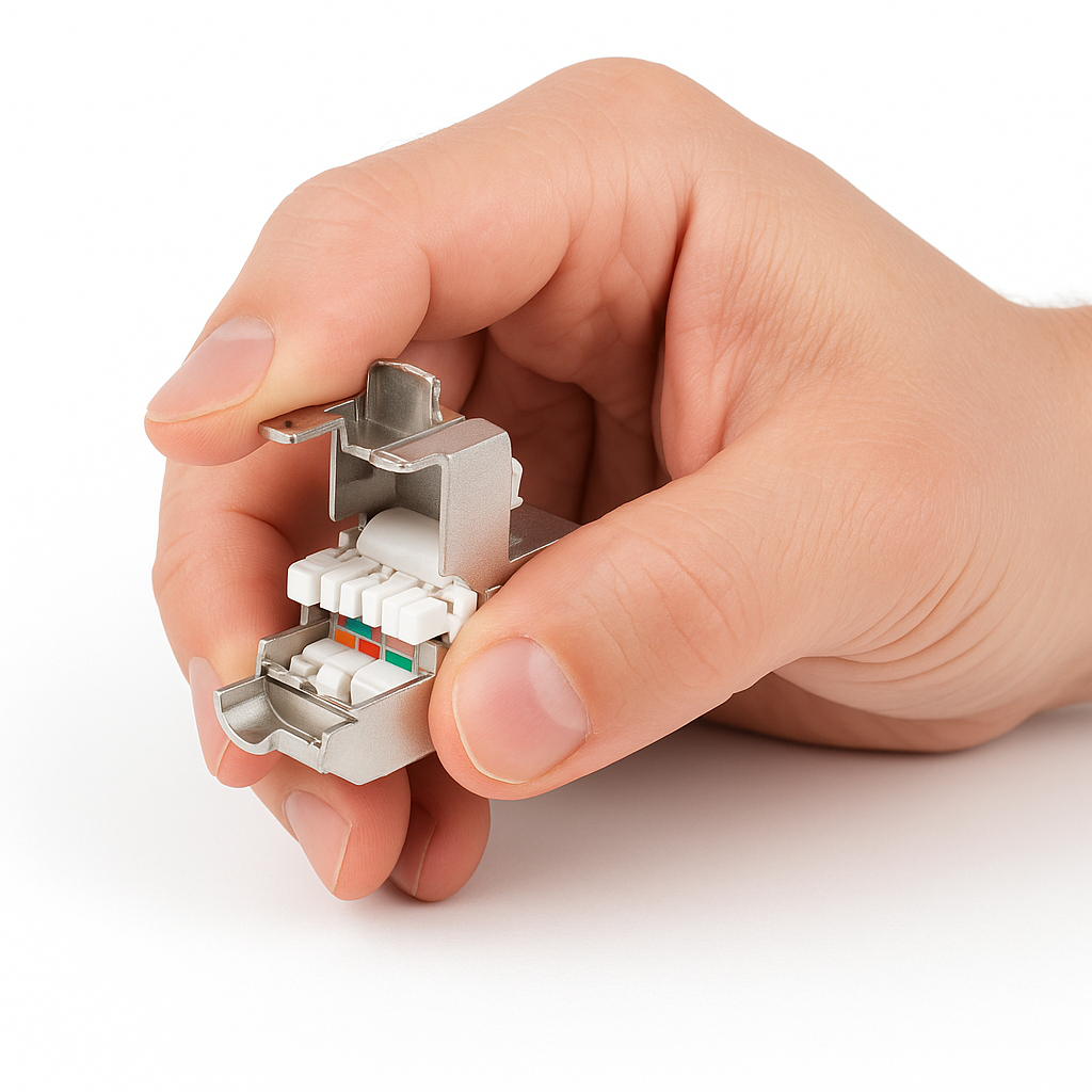 Keystone FTP RJ45 kat.7 umożliwia zakończenie żył kabla bez użycia jakichkolwiek narzędzi specjalistycznych. Dzięki ergonomicznej konstrukcji montaż można wykonać bezpośrednio w dłoniach – szybko, wygodnie i niezawodnie. To praktyczne rozwiązanie, idealne do stosowania w gniazdach przyłączeniowych oraz panelach montażowych.