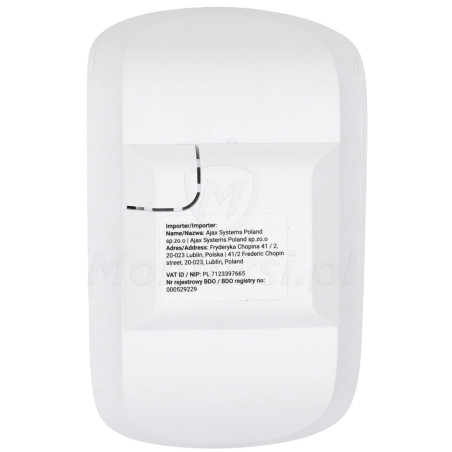 MotionProtect - Bezprzewodowa czujka ruchu PIR przeznaczona do pracy w systemie alarmowym Ajax. Wyposażona w cyfrowy algorytm detekcji oraz kompensację temperatury gwarantuje wiarygodną detekcję oraz odporność na fałszywe alarmy spowodowane obecnością zwierząt. Urządzenie łączy się z centralą za pomocą drogi radiowej o częstotliwości 868 - 868.6 MHz i wykorzystuje autorski protokół Jeweller.