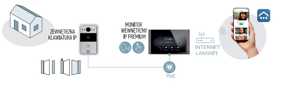 Monitor posiada wbudowany moduł Wi-Fi 6 umożliwiający zdalną obsługę wideodomofonu przez aplikację mobilną, bez potrzeby prowadzenia dodatkowego okablowania. Dodatkowo urządzenie wyposażono w port LAN (RJ-45), który umożliwia stabilne połączenie przewodowe z siecią internetową, co zapewnia niezawodną komunikację z systemem i minimalizuje ryzyko zakłóceń. Obecność Wi-Fi oraz LAN zwiększa elastyczność instalacji i komfort użytkowania, umożliwiając wybór najwygodniejszego sposobu podłączenia.
