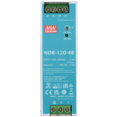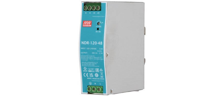 NDR-120-48 – Zasilacz na szynę DIN, dedykowany do współpracy z urządzeniami elektrycznymi 48V DC, których maksymalny pobór prądu nie przekracza 2.5A. Posiada płynną regulację napięcia 48 - 55 V DC.