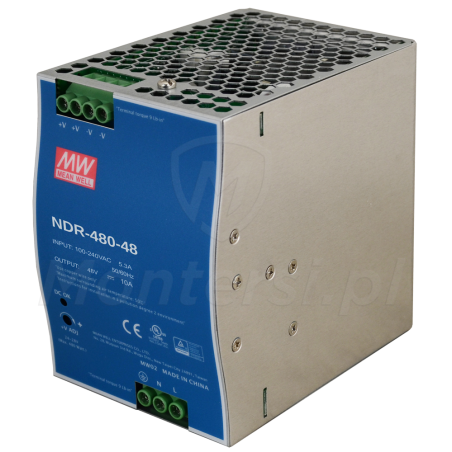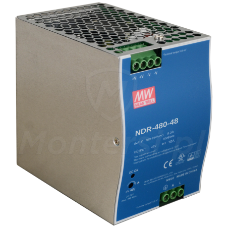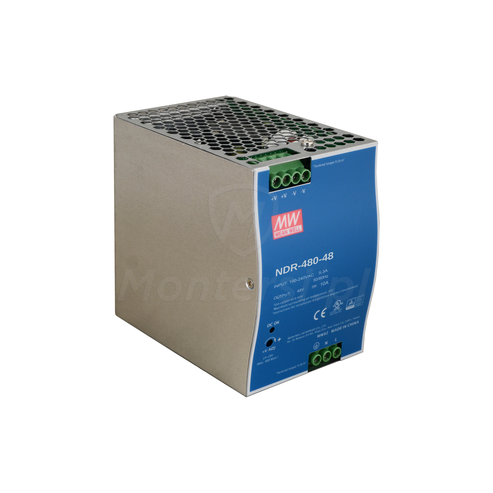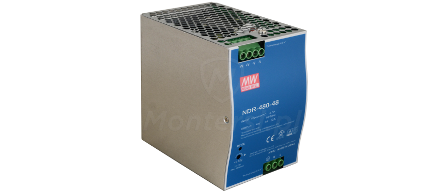 NDR-480-48 - Zasilacz na szynę DIN, dedykowany do współpracy z urządzeniami elektrycznymi 48V DC, których maksymalny pobór prądu nie przekracza 10A.