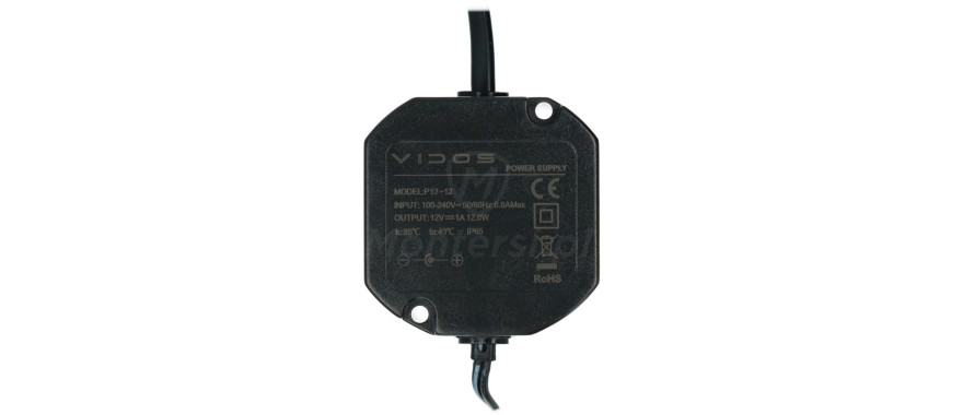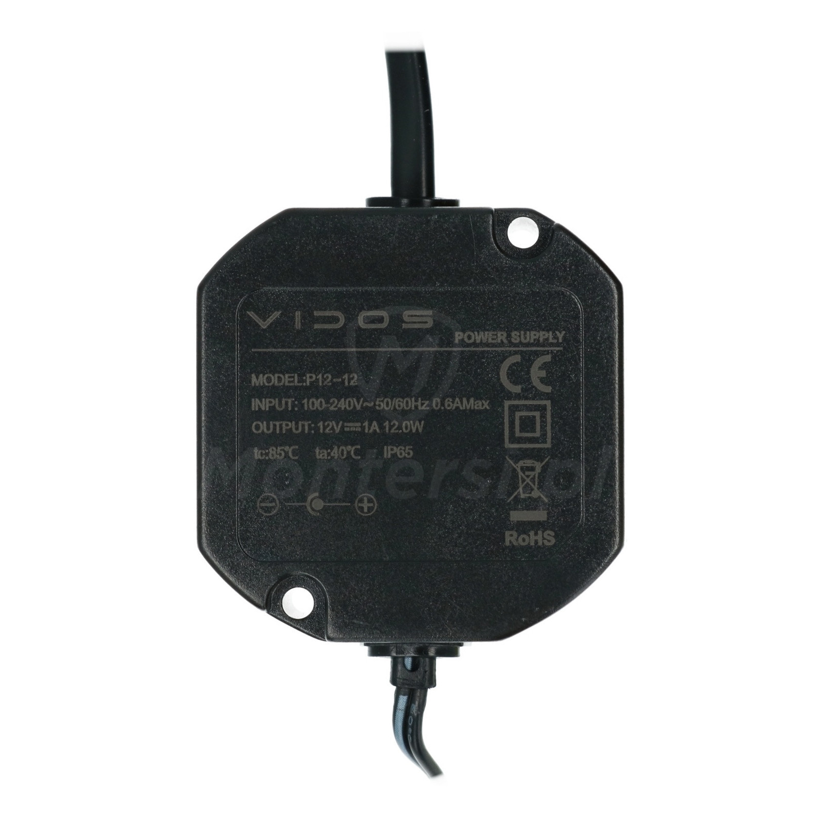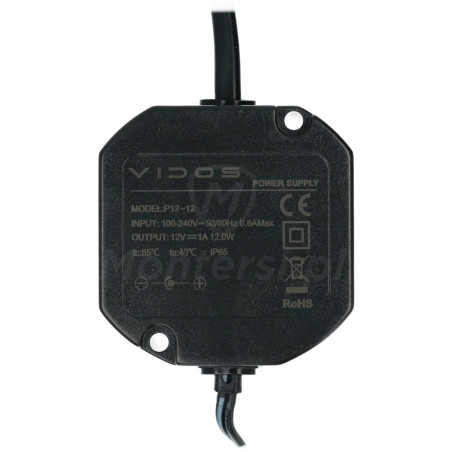 P12/12 - Impulsowy zasilacz dopuszkowy przeznaczony do systemów wideodomofonowych Vidos. Urządzenie charakteryzuje się napięciem wyjściowym na poziomie 12 V oraz prądem maksymalnym 1 A.