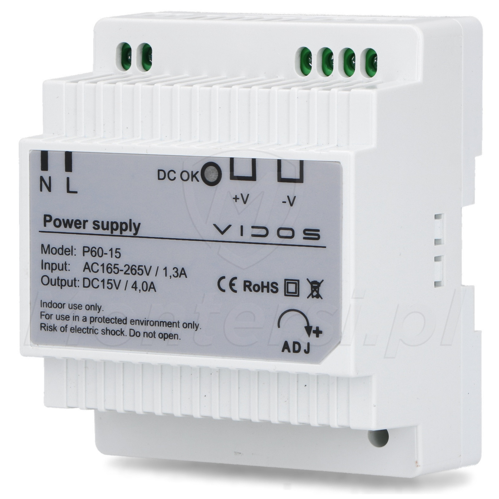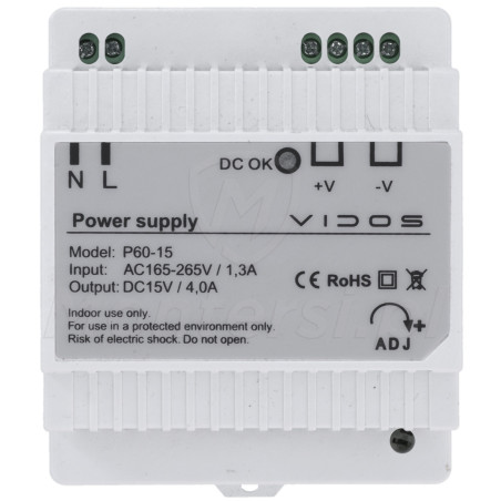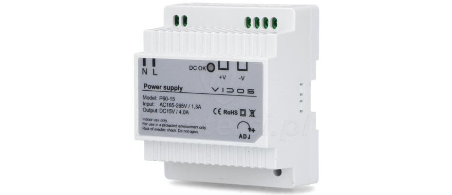 P60/15 - Zasilacz do systemów wideodomofonowych Vidos przystosowany do montażu na szynę DIN. Urządzenie może zasilać odbiorniki o maksymalnej mocy 60 W ( prąd max 4 A). Dodatkową zaletą zasilacza jest możliwość płynnej regulacji napięcia w przedziale 14-16 V.