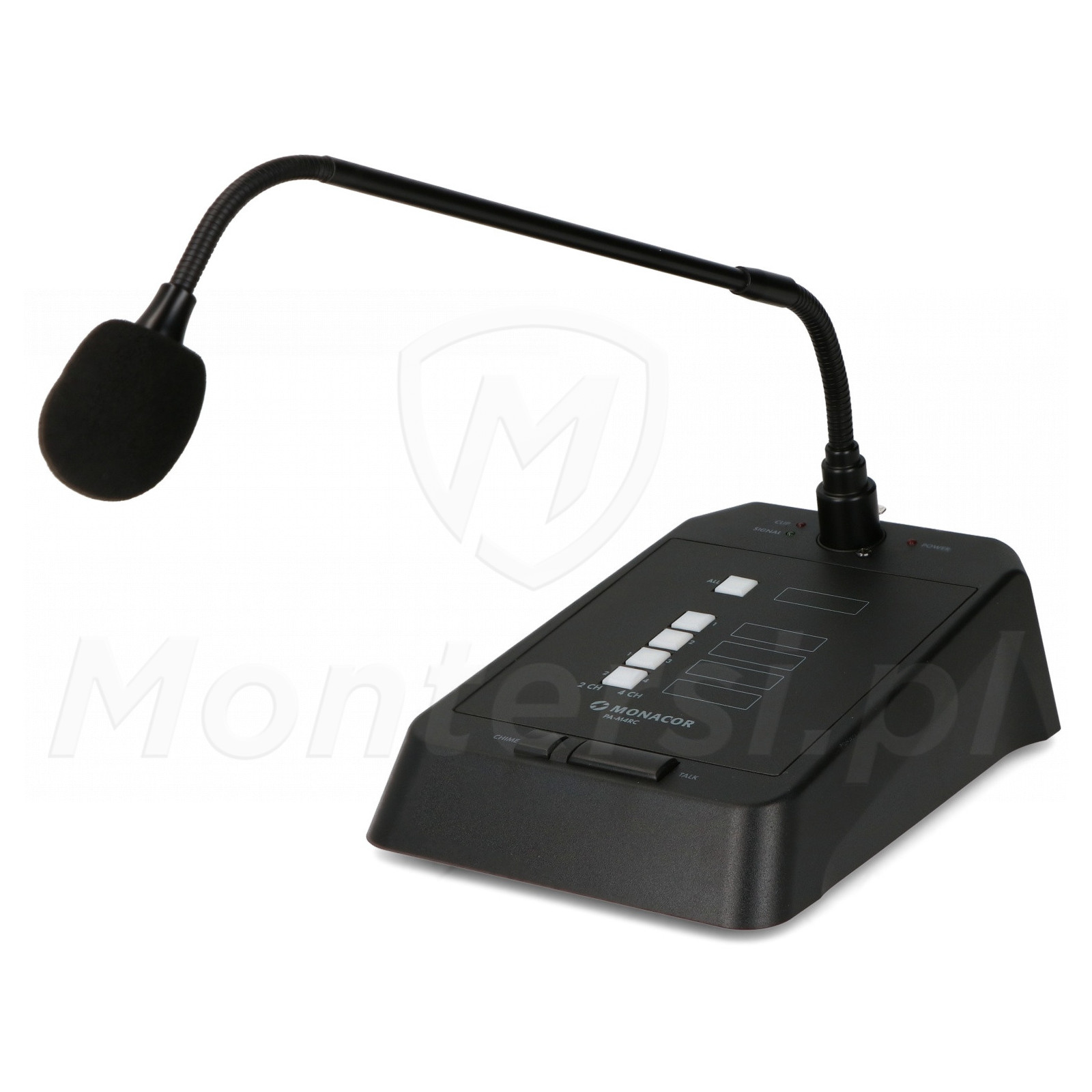 PA-M4RC - Mikrofon pulpitowy na gęsiej szyi do systemów PA przeznaczony do współpracy z wzmacniaczem PA-M224 oraz PA-M412. Wysokiej jakości 4 strefowy mikrofon firmy Monacor. Pulpitowy mikrofon elektretowy z odbiornikiem o charakterystyce dookólnej. Mikrofon wyposażony jest w przyciski umożliwiające adresowanie jednej wybranej strefy oraz przycisk ALL CALL do wyboru wszystkich 4 stref jednocześnie. Najważniejsze cechy mikrofonu to: