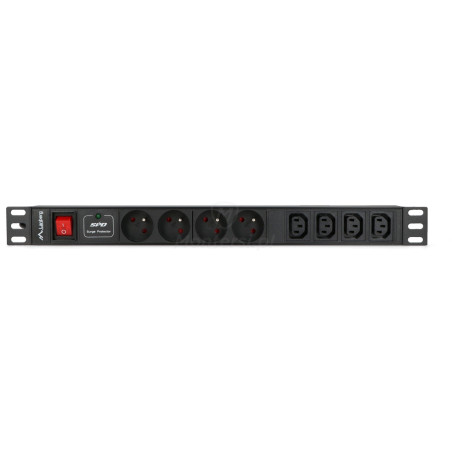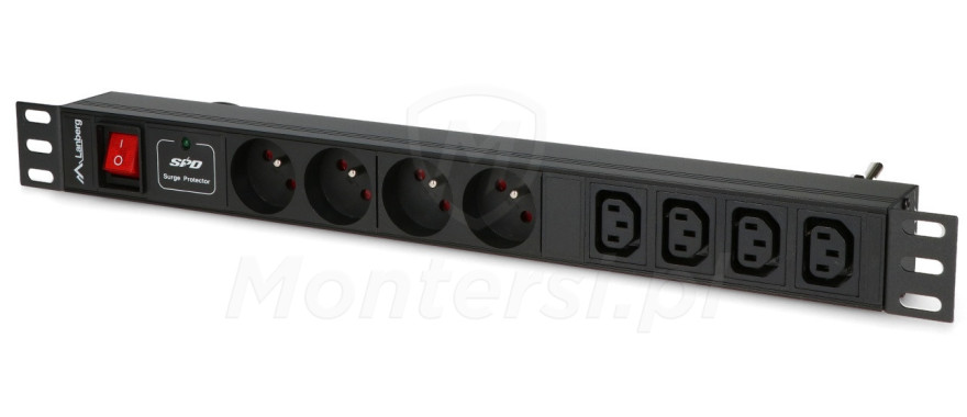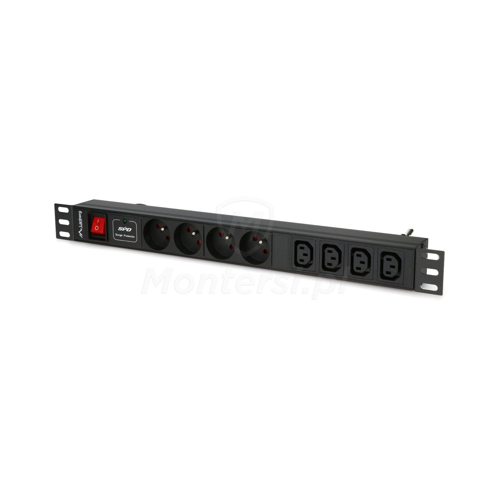 PDU 19" - Profesjonalna listwa do dystrybucji zasilania. Jej konstrukcja została przygotowana wyłącznie do poziomego montażu doczołowego we wszystkich rodzajach szaf RACK 19". Wyposażona została w jednofazowe wejście zasilania z kablem o długości 2 metrów. Listwa oprócz dystrybucji zasilania oferuje dodatkowy poziom ochrony min. ochronę przeciwprzeciążeniową. Dodatkowo wyposażona została w bezpiecznik automatyczny, który sygnalizuje prawidłową pracę listwy przez zieloną diodę.