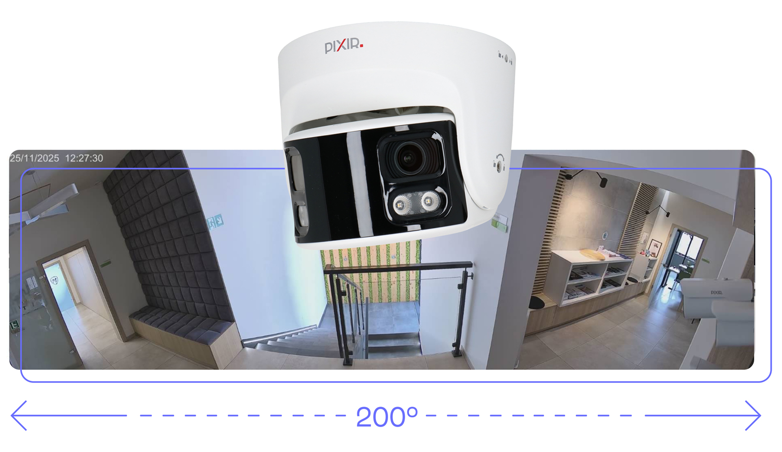 Panoramiczny Obraz 200° dzięki podwójnemu obiektywowiPełna scena w proporcjach 32:9Kamera wykorzystuje podwójny obiektyw oraz technologię łączenia obrazu, aby uzyskać ultraszeroki, 200 stopniowy panoramiczny widok prezentowany na jednym ekranie w kinowych proporcjach 32:9. Zaawansowane łączenie obrazu eliminuje zniekształcenia typowe dla obiektywów typu „rybie oko”, oferując naturalny i spójny obraz całej sceny. Tak szerokie pole widzenia pozwala jednocześnie monitorować obie strony otoczenia |