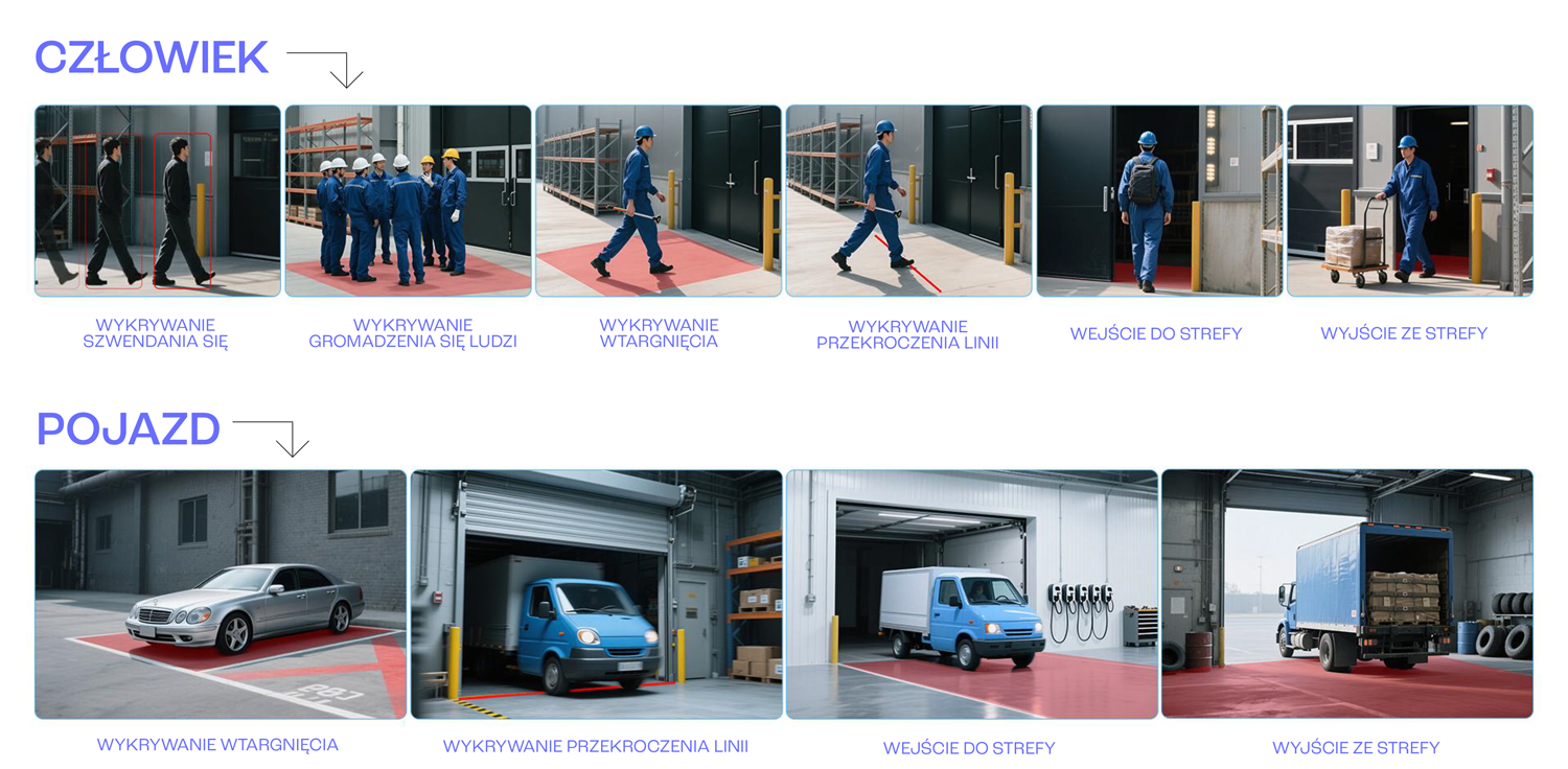 Inteligentna analiza obrazuZaawansowane scenariusze nagrywaniaKamera obsługuje również funkcje inteligentnej analizy obrazu, dzięki którym możliwe jest tworzenie zaawansowanych scenariuszy nagrywania. Funkcje analityczne znacznie poprawiają możliwości nadzoru systemu, przez jego lepsze dopasowanie do wymagań klienta i specyfiki samego obiektu. Do obsługiwanych funkcji inteligentnej analizy można zaliczyć: