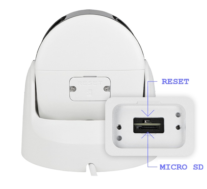 Wbudowana kieszeń na kartę microSD - do 512 GBLokalna archiwizacja nagrańKamera posiada wbudowany slot microSD, umożliwiający lokalne przechowywanie nagrań do 512 GB. Dzięki temu może działać autonomicznie – bez rejestratora. Slot znajduje się pod zabezpieczoną pokrywą i jest łatwo dostępny od spodu obudowy. Obok umieszczono przycisk resetowania ustawień. |