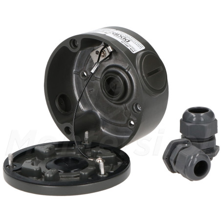 PIX-JBU-G - Metalowy uchwyt montażowy do kamer kopułowych PIXIR. W jego wnętrzu znajduje się pusta przestrzeń, która umożliwia podłączenie i ukrycie przewodu połączeniowego. Uchwyt PIX-JBU jest kompatybilny z kamerami: