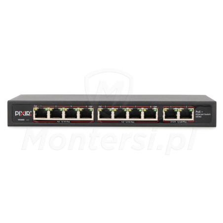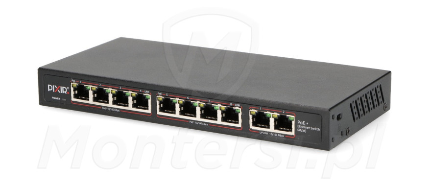Model PIX-POE8AT-2FE posiada wbudowane 8 portów PoE w standardzie 802.3af i 802.3at (PoE / PoE+). Służą one zarówno do transmisji danych i zasilania podłączonych kamer PoE, po tym samym kablu UTP.
