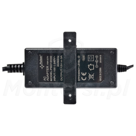 PSD12030 - Stabilizowany zasilacz impulsowy, przystosowany do współpracy z urządzeniami 12V DC, których maksymalny pobór prądu nie przekracza 3 A. Jest w szczególności dedykowany do zasilania kamer monitoringu przemysłowego - posiada wtyk DC 5.5/2.1 osadzony na kablu o długości 145 cm i uchwyty montażowe na moduł zasilacza.