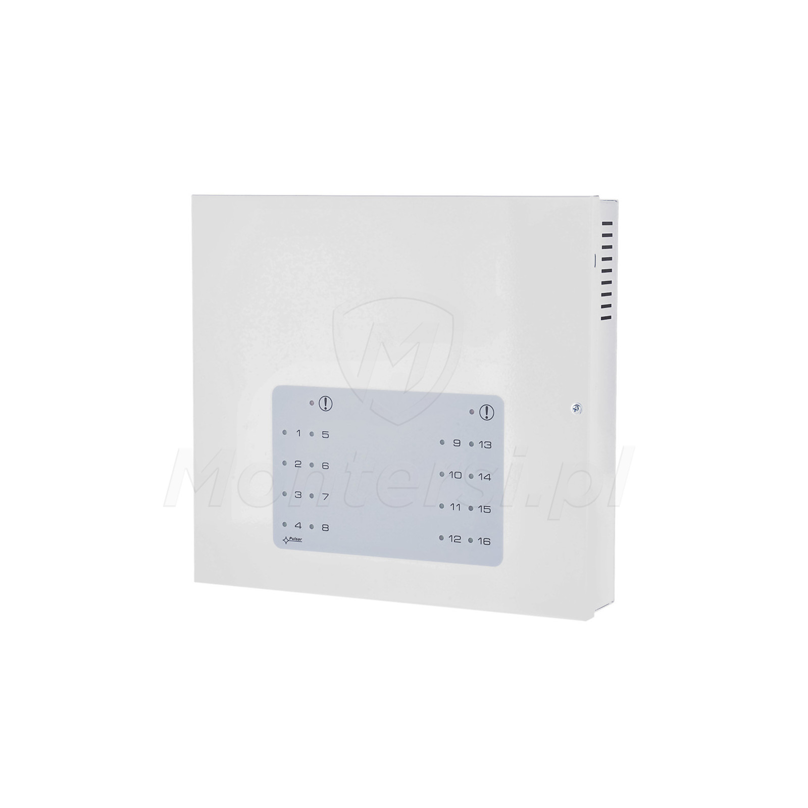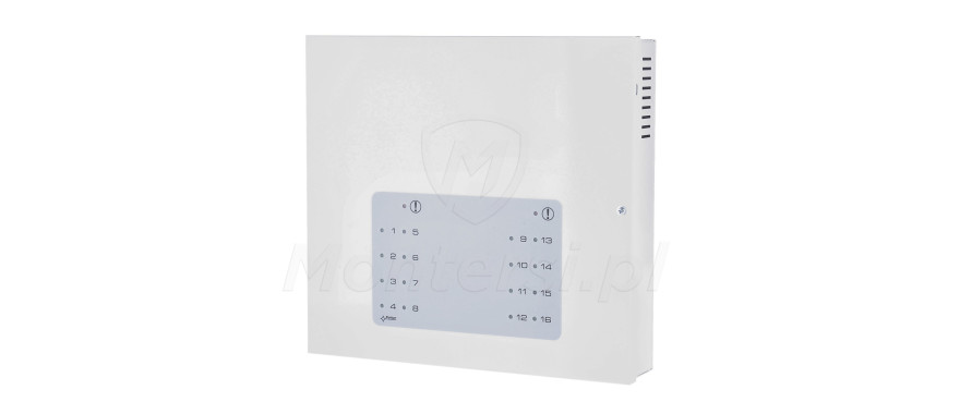 PSDC16128 - Stabilizowany zasilacz impulsowy przystosowany do zasilania urządzeń systemu alarmowego lub telewizji przemysłowej, które wymagają napięcia zasilania 12V DC. Jest wyposażony w 16 wyjść zasilania, każde o obciążalności prądowej 0.5 A i 1 wyjście techniczne AW typu OC (awaryjne typu otwarty kolektor).