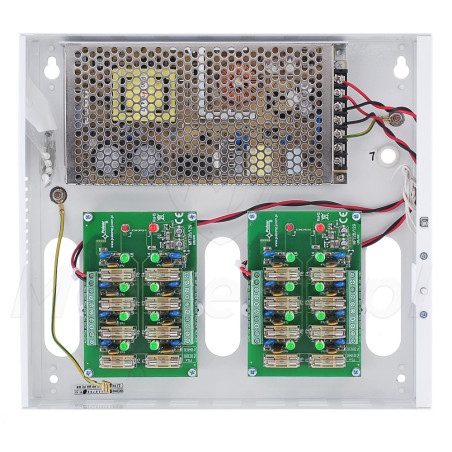 Każde wyjście zasilania jest zabezpieczone bezpiecznikami topikowymi lub PTC i wartość jego napięcia może być regulowana w zakresie od 12 do 15V DC. Obudowa o klasie szczelności IP20 (wykonana z metalu i przeznaczona do montażu natynkowego) posiada styk sabotażowy, umożliwiający podłączenie do systemu alarmowego. Na obudowie znajduje się również panel z diodami LED, który informuje o stanie poszczególnych wejść.