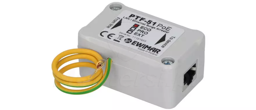 PTF-51-ECO/PoE/DIN - 1-kanałowy ogranicznik przepięć montowany na szynę DIN, dedykowany do pracy w sieci LAN fast ethernet (10 / 100 M). Przy jego pomocy można w skuteczny sposób zrealizować ochronę linii transmisji danych i zasilania PoE, przed przepięciami. Przez co sprawdza się on świetnie w systemach monitoringu IP, do realizacji ochrony kamer i podłączonych do nich switchy.