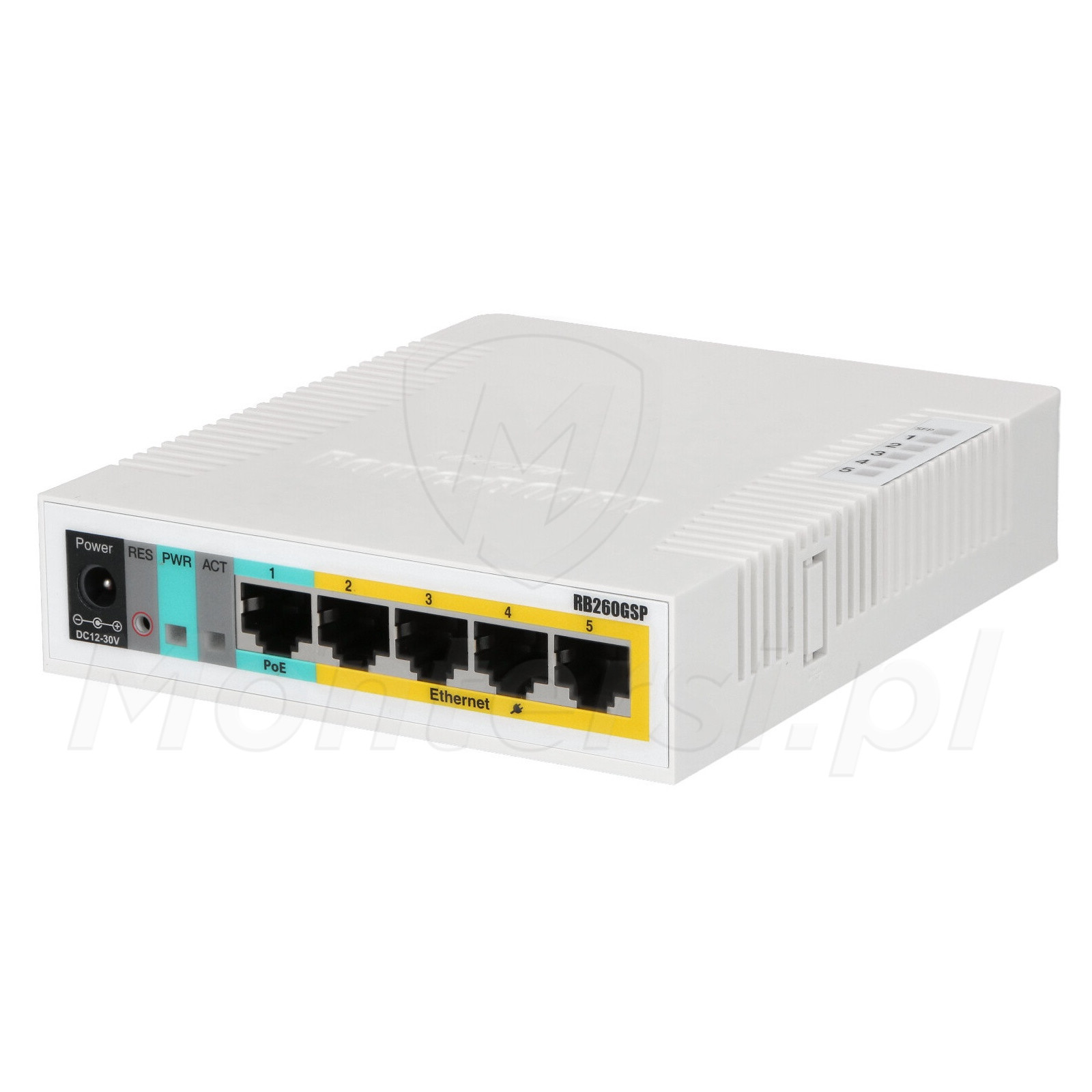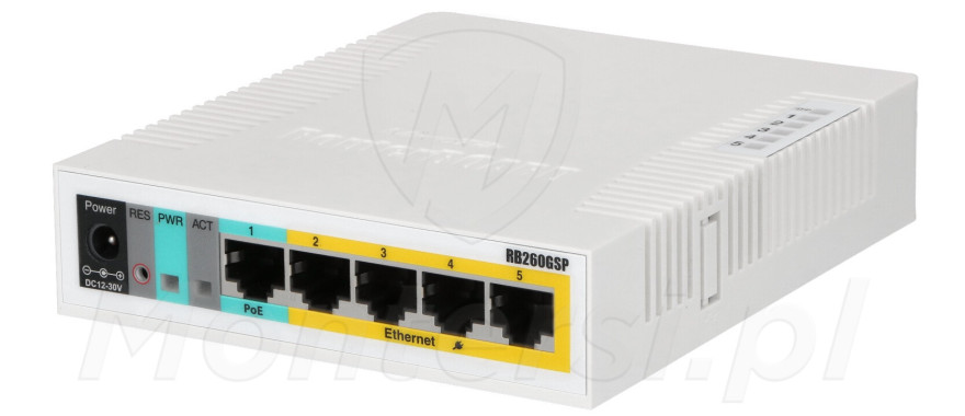 RB260GSP - Zarządzalny switch wyposażony w 5 gigabitowych portów ethernet oraz slot na wkładkę SFP. Sprawdzi sie w systemach monitoringu oraz przy tworzeniu sieci internetowych. Wyposażony w 3 porty PoE umożliwiające zasilanie oraz transmisję danych jednocześnie. Jako najważniejsze cechy switcha wymienić można: