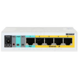 RB260GSP wyposażony został w pięć złączy LAN. Port 1 to PoE In - pozwalający na zasilanie poprzez PoE Passive. Pozostałe porty 2-5 umożliwiają transmisję danych oraz zasilanie urządzeń podłączonych do switcha w standardzie Passive PoE. W ten sposób znacząco zredukujemy ilość potrzebnego okablowania.