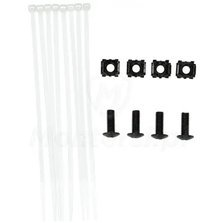 - Śruby montażowe, nakrętki klatkowe i opaski kablowe w komplecie