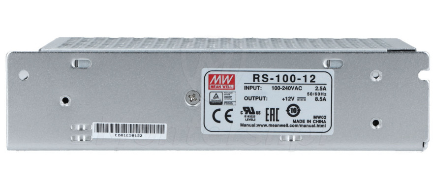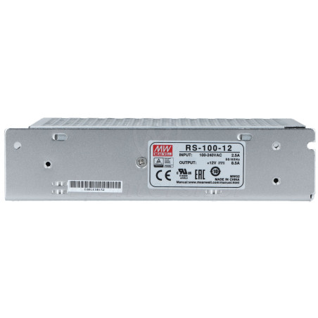 Modułowy zasilacz impulsowy, przystosowany do zasilania urządzeń elektrycznych wymagających napięcia 11.4 - 13.2V DC (8.5 A). RS-100-12 został zaprojektowany w zgodnie z surowymi standardami, dzięki czemu cechuje się bardzo dobrymi parametrami pracy i długim czasem życia. Model może być z powodzeniem używany do zasilania systemów sterowania, oświetlenie i innych podobnych.