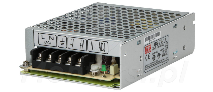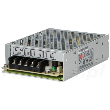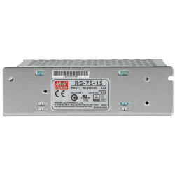 Modułowy zasilacz impulsowy, przystosowany do zasilania urządzeń elektrycznych wymagających napięcia 13.5 - 16.5V DC (5 A). RS-75-15 został zaprojektowany w zgodnie z surowymi standardami, dzięki czemu cechuje się bardzo dobrymi parametrami pracy i długim czasem życia. Model może być z powodzeniem używany do zasilania systemów sterowania, oświetlenie i innych podobnych.