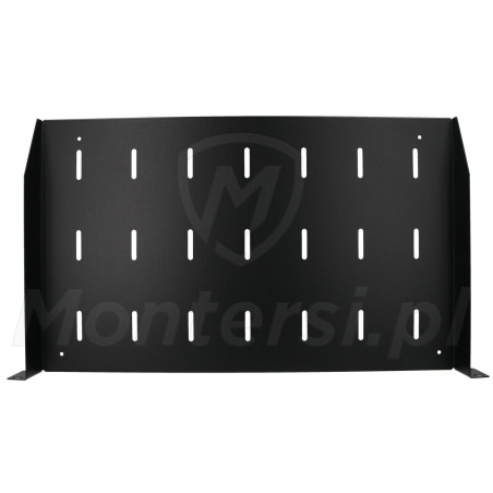 RSF19-1U-300B - Półka pozwalająca na montaż w szafie typu RACK 19"urządzeń niewyposażonych w uchwyty montażowe. Dzięki niej możemy w szafie zainstalować praktycznie dowolne urządzenie. Spód półki posiada otwory, które mogą posłużyć do zabezpieczenia sprzętu np. opaskami zaciskowymi. Dodatkowo otwory zapewniają grawitacyjną cyrkulację powietrza co korzystnie wpłynie na chłodzenie urządzenia położonego na niej. Półka została wykonana z blachy stalowej walcowanej na zimno o grubości od 0.8 do 1.2 mm co gwarantuje jej stabilność.
