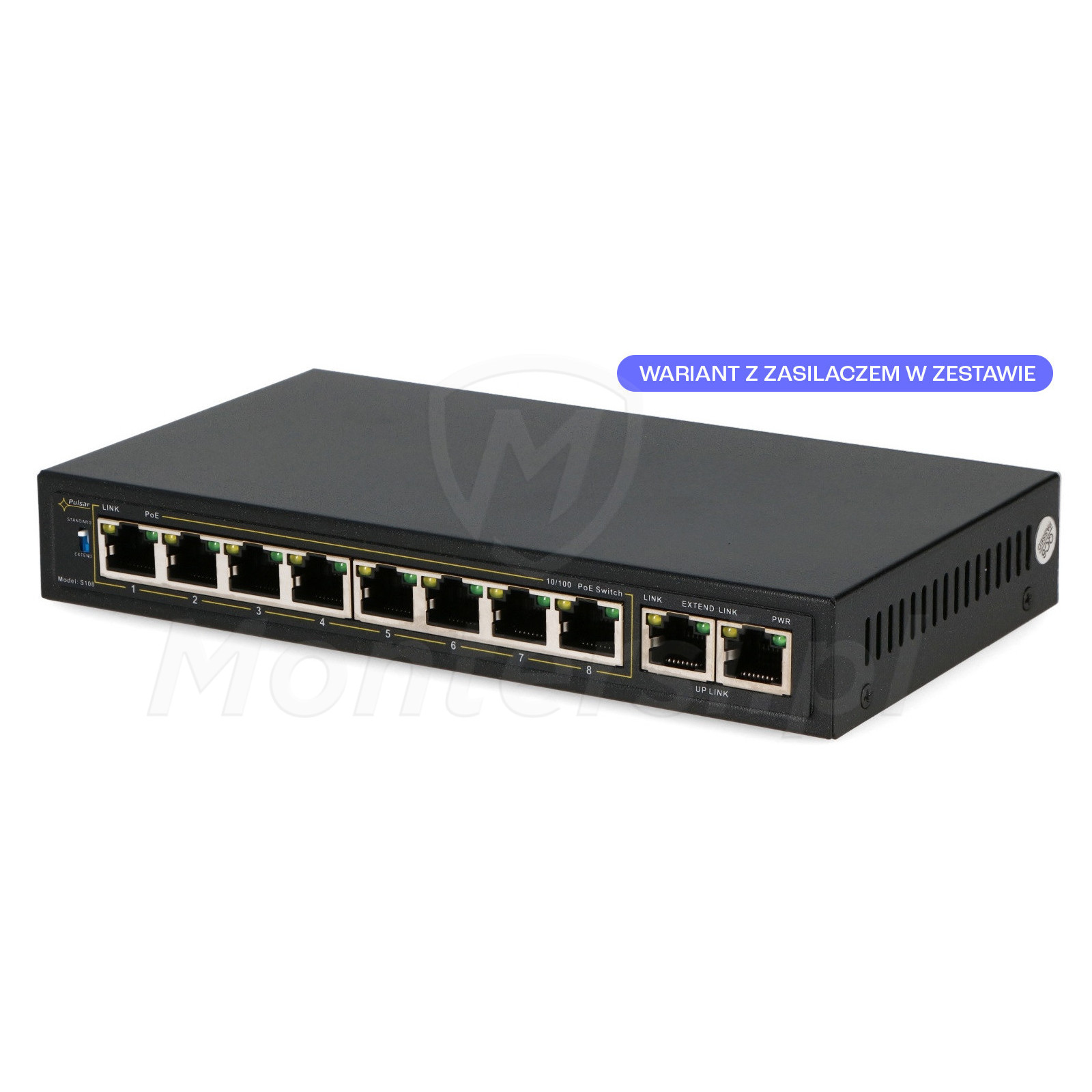 S108 - 10-portowy switch PoE, przeznaczony do pracy w systemie monitoringu IP. Niezawodny i prosty w obsłudze, umożliwia realizację zasilania i transmisji danych z maksymalnie 8 kamer PoE.