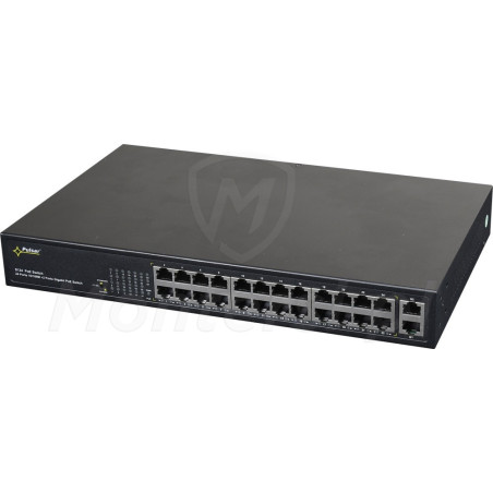 Switch posiada 24 portów obsługujących technologię Power over Ethernet, w standardach IEEE 802.3af i IEEE 802.3at. Dzięki nim można w wygodny sposób zrealizować zasilanie i transmisję danych z kamer po kablu UTP. Obsługa standardów PoE i PoE+, umożliwia realizację zasilania klasycznych kamer PoE i kamer PoE PTZ.