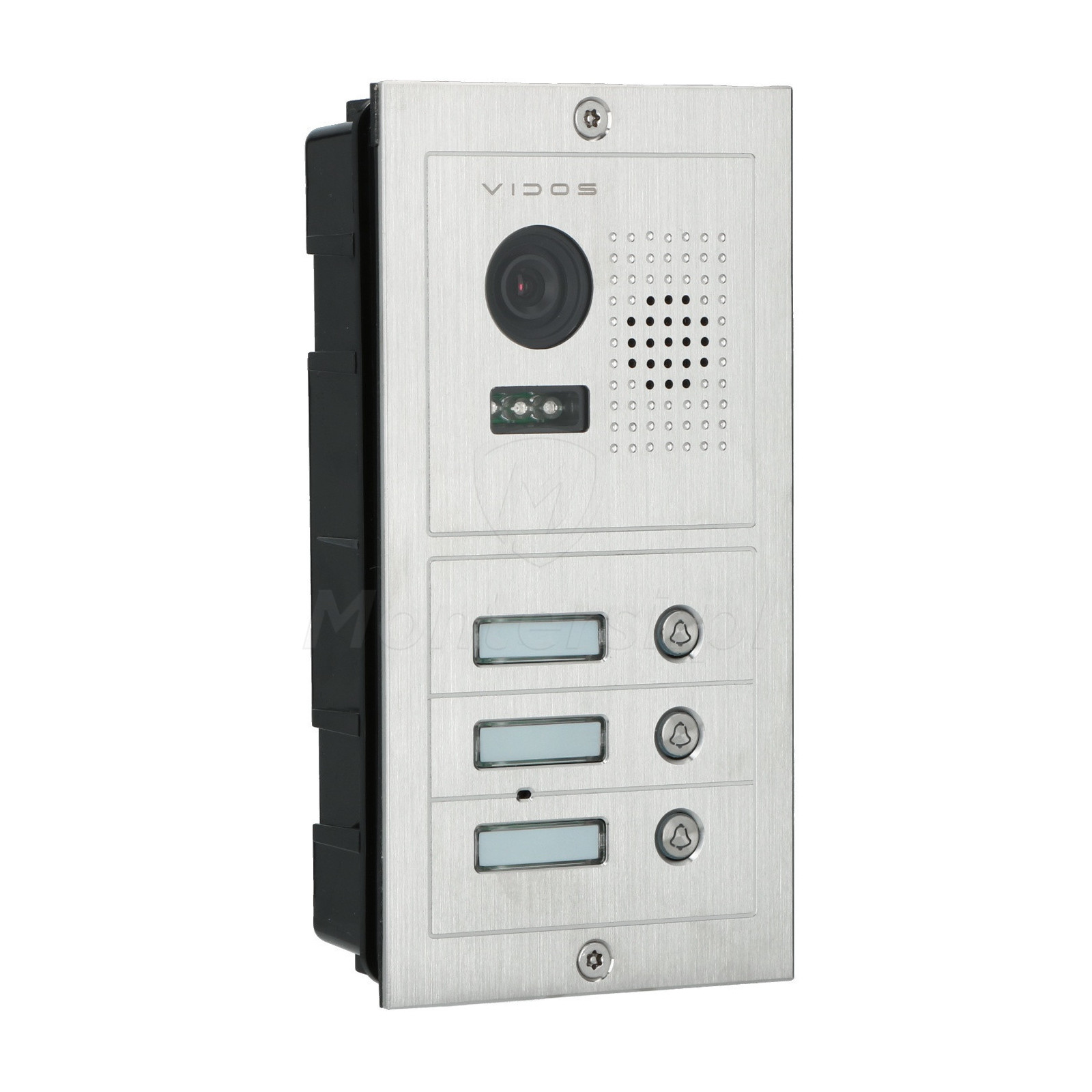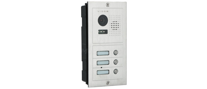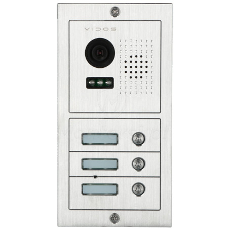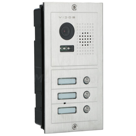 S603 - 3-abonentowa stacja bramowa, przystosowana do współpracy z systemami Vidos. Została wyposażona w 3 podświetlane przyciski, szyldy na nazwisko i kolorową, regulowaną kamerę z oświetlaczem podczerwieni. Panel bramowy świetnie sprawdza się w systemach wideodomofonowych domów wielorodzinnych.