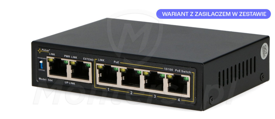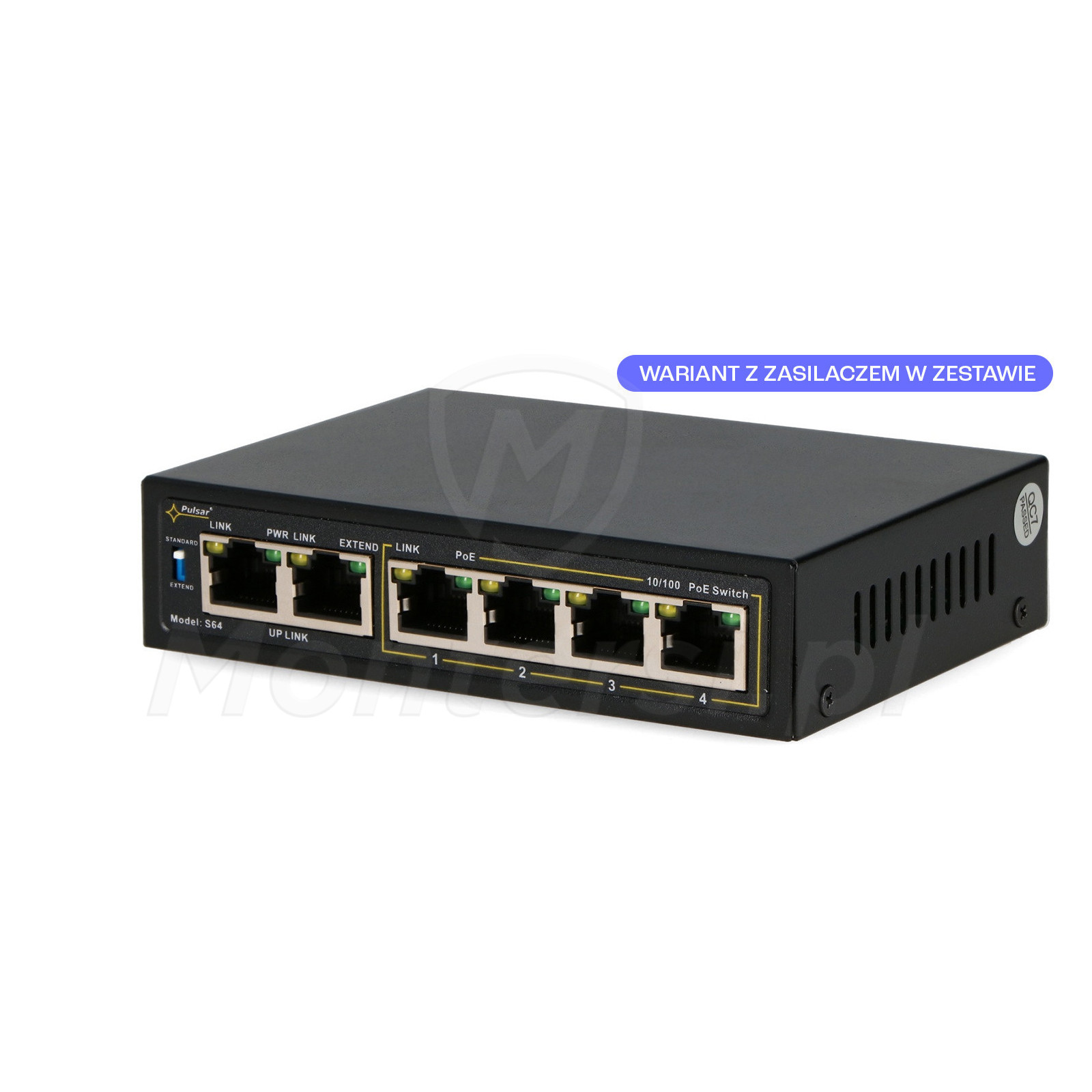 S64 - 6-portowy switch PoE, dedykowany do pracy w systemie monitoringu IP. Przy jego pomocy można w prostu sposób zrealizować transmisję danych i zasilanie 4 kamer PoE. Dzięki czemu, sprawdza się on świetnie w małych i miniaturowych systemach CCTV IP. Przykładowo można go wykorzystać do budowy systemu monitoringu w mieszkaniu, domu, sklepie lub biurze.