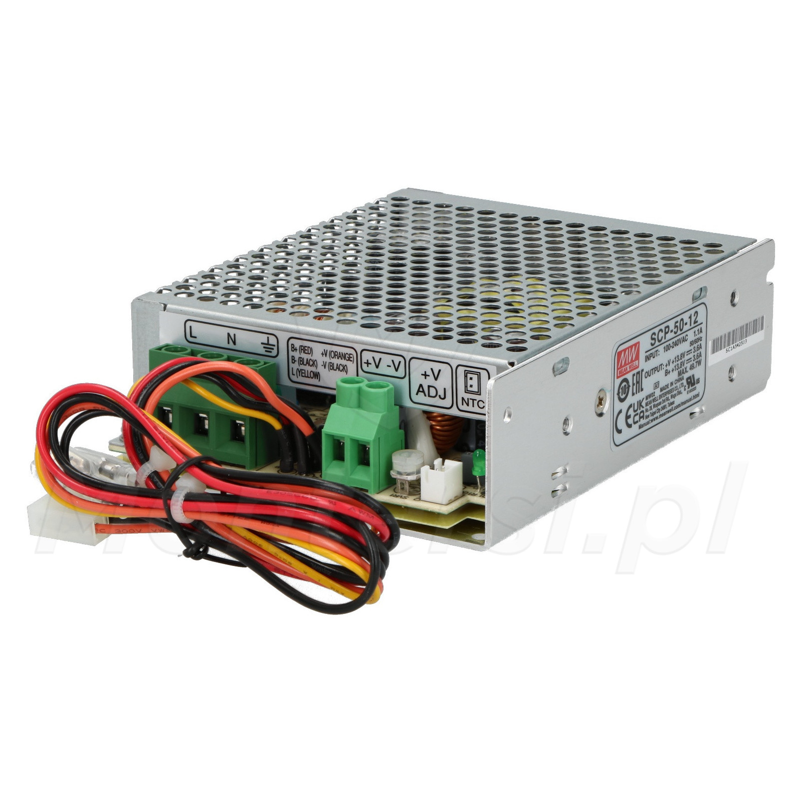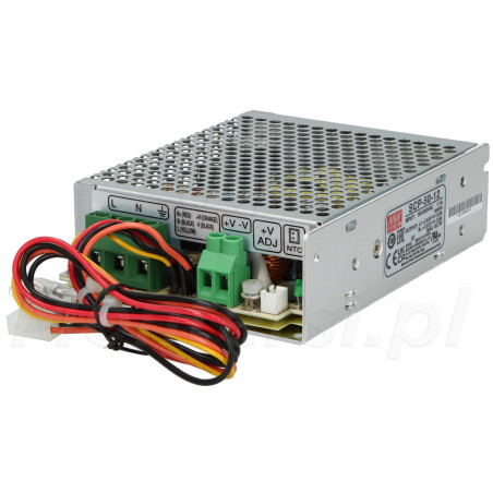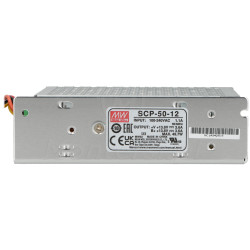 SCP-50-12 - Zasilacz buforowy współpracujący z urządzeniami przemysłowymi wymagających stabilizowanego napięcia zasilania 13.8V DC. Doskonale sprawdza się w systemach monitoringu, oświetlenia, sterowania, itp.. Jest w stanie zasilić elementy systemu o maksymalnym poborze prądu 3.6 A. Zasilacz cechuje się małą odpornością na wpływ czynników zewnętrznych, dlatego powinien być montowany w przystosowanej do tego obudowie.