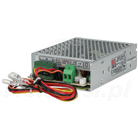 SCP-50-24 - Zasilacz buforowy współpracujący z urządzeniami przemysłowymi wymagających stabilizowanego napięcia zasilania 27.4V DC. Doskonale sprawdza się w systemach monitoringu, oświetlenia, sterowania, itp.. Jest w stanie zasilić elementy systemu o maksymalnym poborze prądu 1.8 A. Zasilacz cechuje się małą odpornością na wpływ czynników zewnętrznych, dlatego powinien być montowany w przystosowanej do tego obudowie.