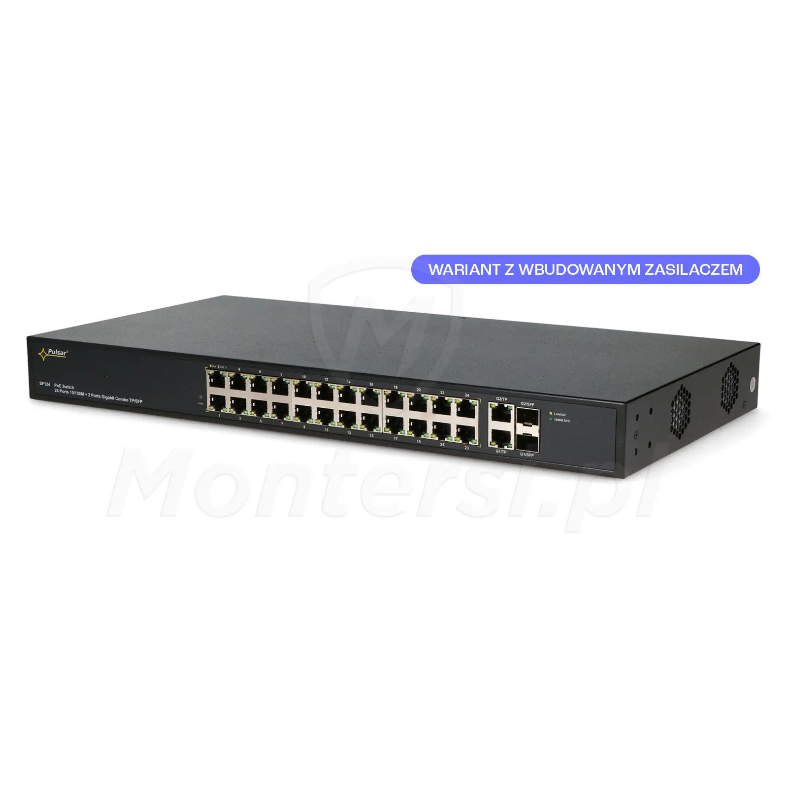 - Wbudowane 24 porty PoE 802.3af / 802.3at fast ethernet, do podłączenia kamer